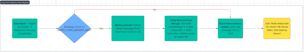 Our implementation uses a hybrid approach combining Redis for short-term storage and Upstash Vector for long-term persistence. When a new message arrives and the short-term memory limit is reached, the system:
