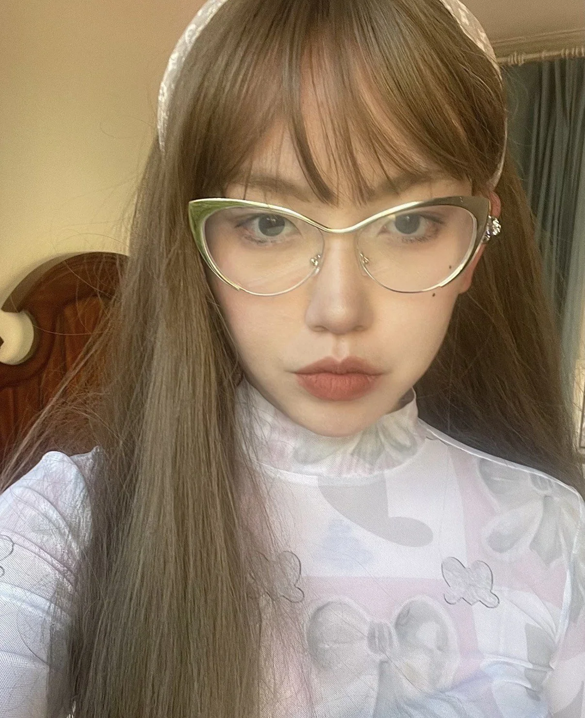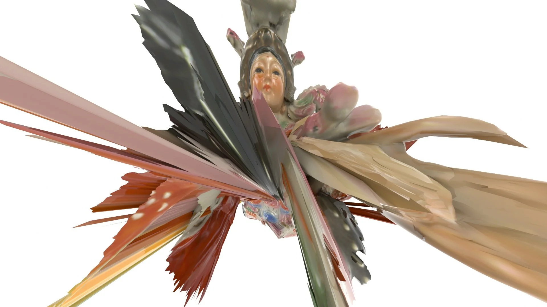 The image opens like a wound. A figure — porcelain, spectral, almost divine — is hurled through a shatter of digital planes. Her face, calm yet ruptured, peers through a storm of fractured textures. Beige, rose, copper, and shadow collide in streaks, as if the digital surface itself has imploded under emotional pressure.